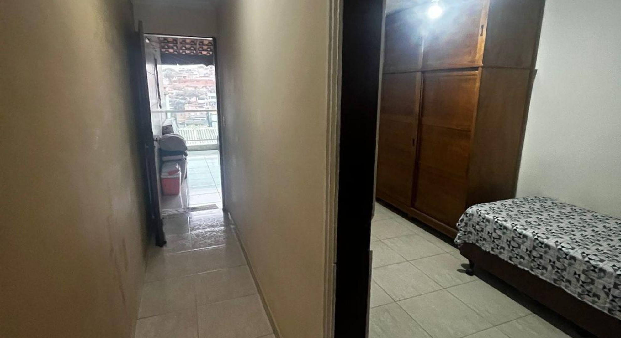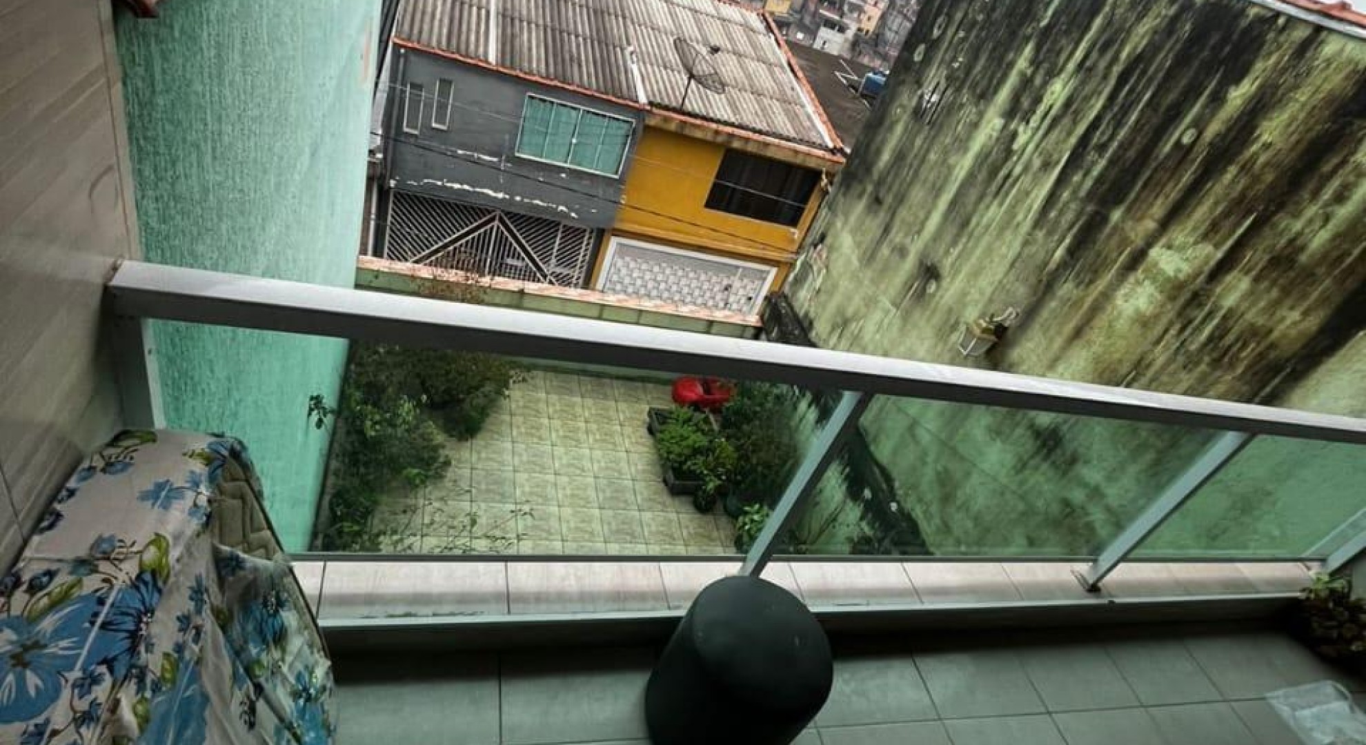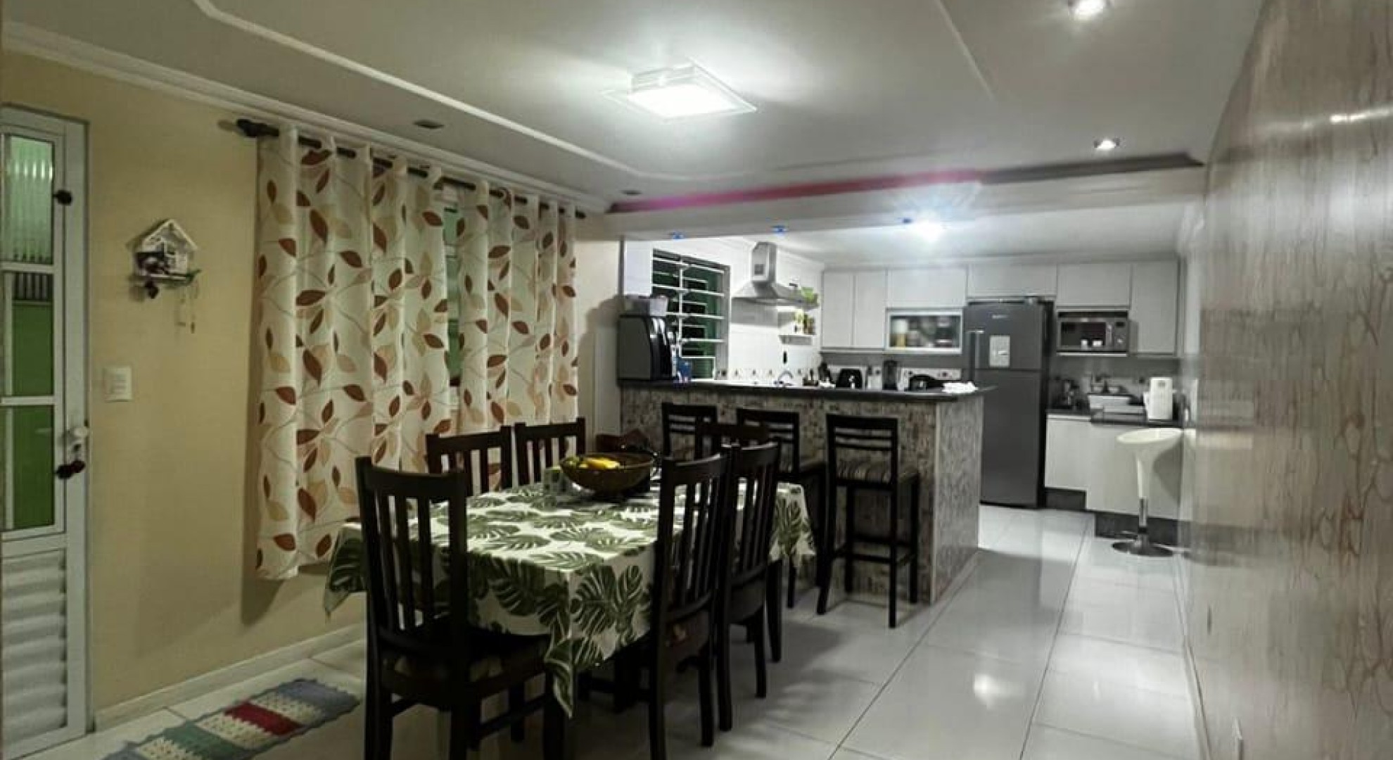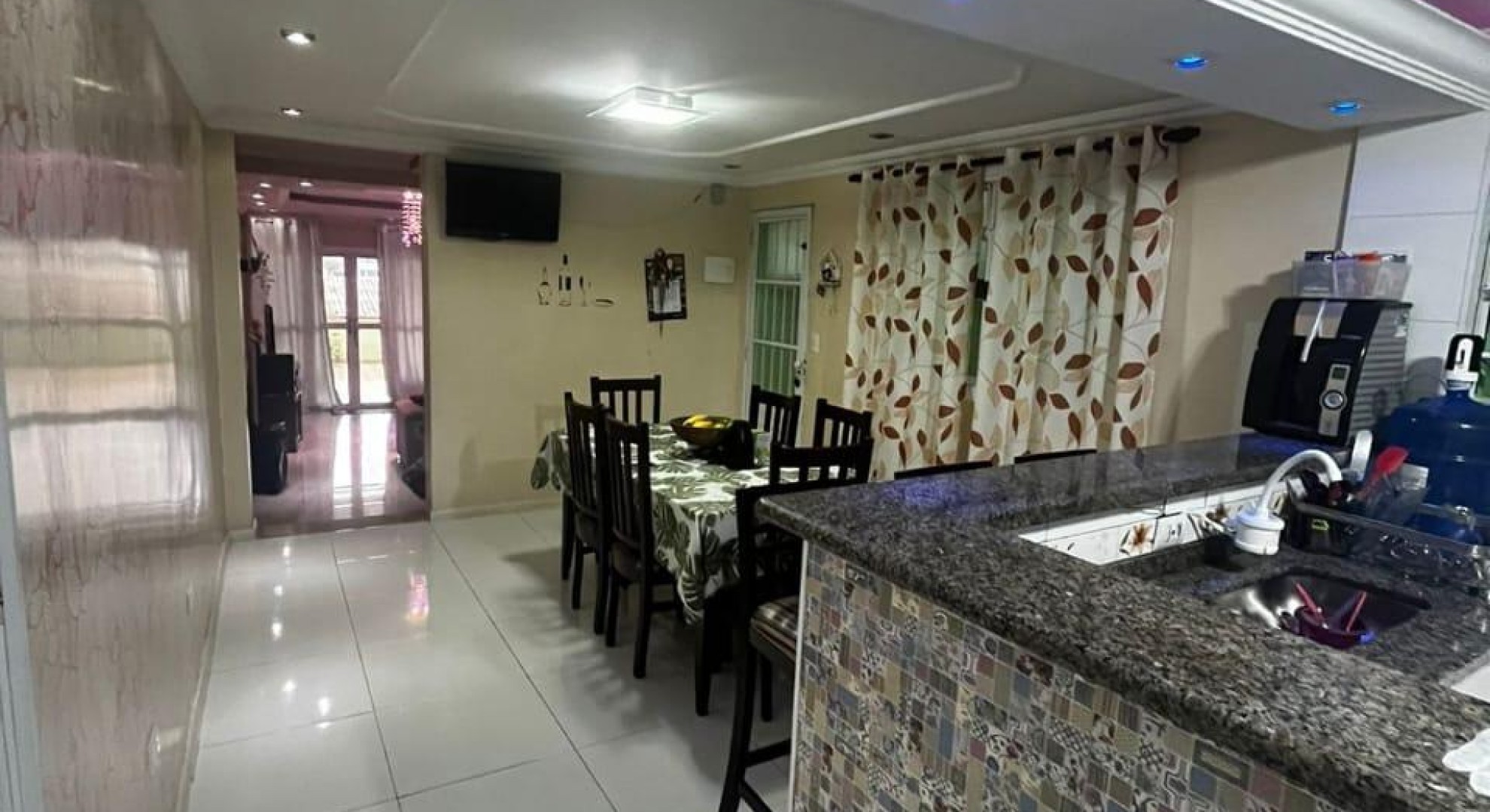 Tem 3 quartos, sala de jantar e sala de estar, cozinha, área de serviço com churrasqueira, e garagem com vaga até 2 carros.