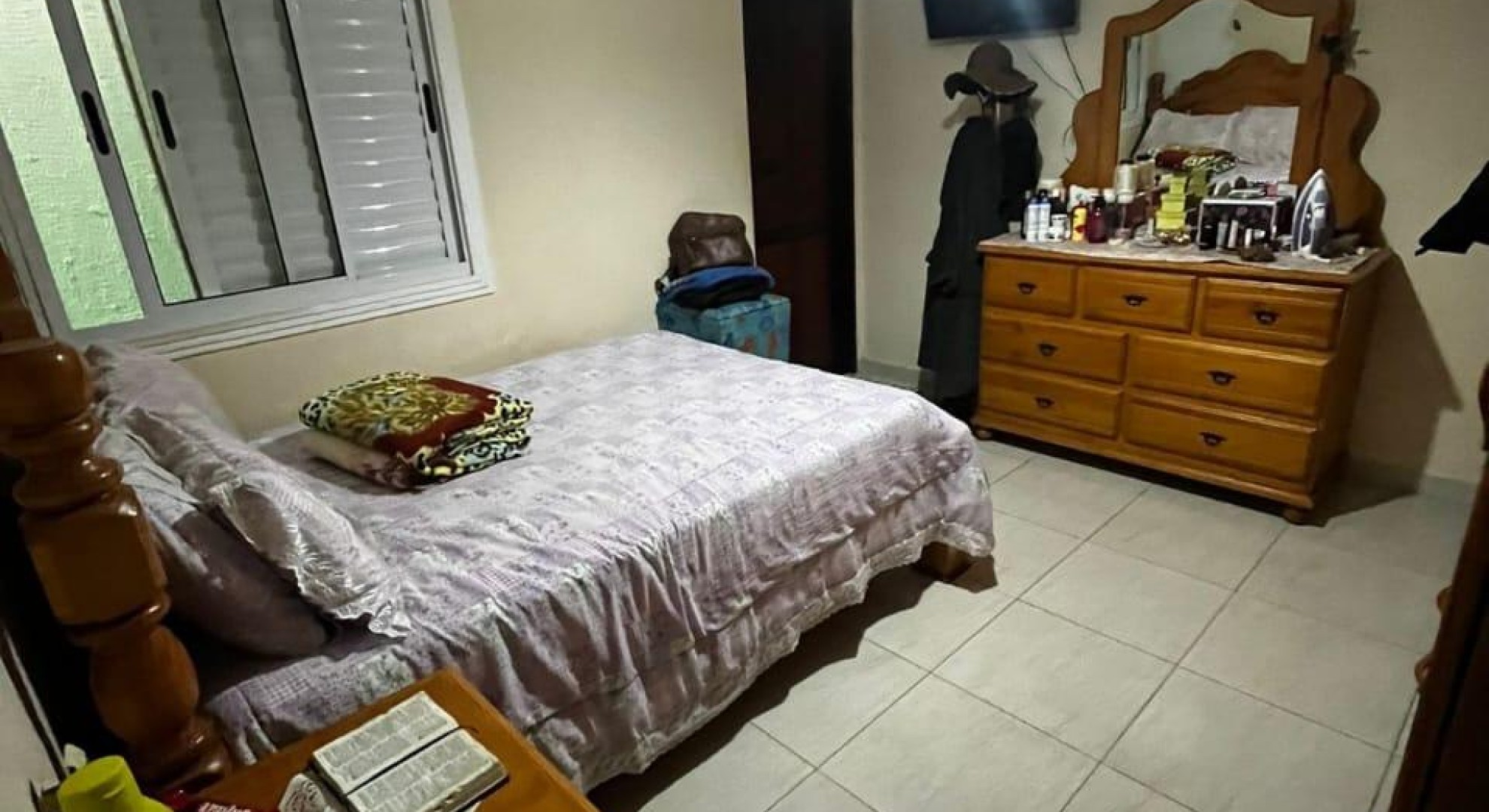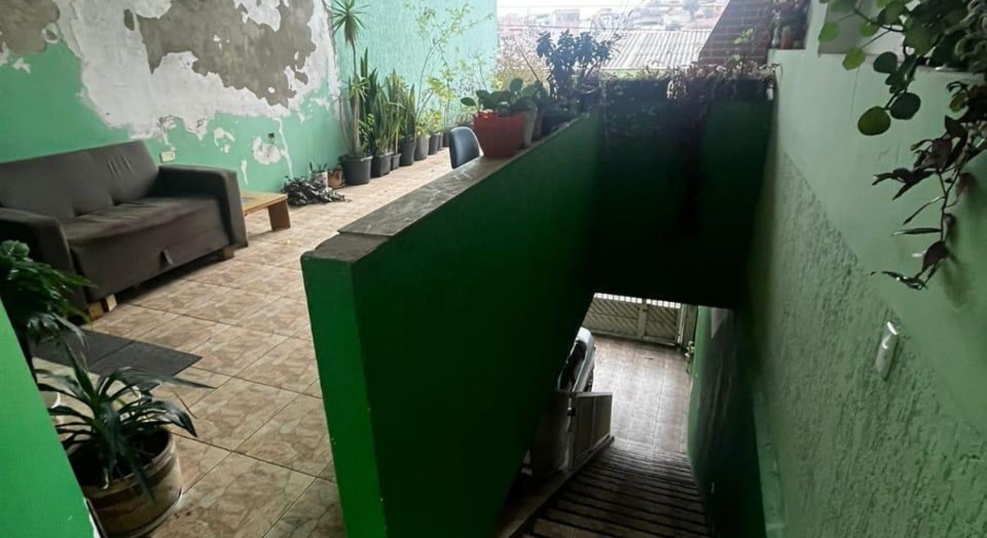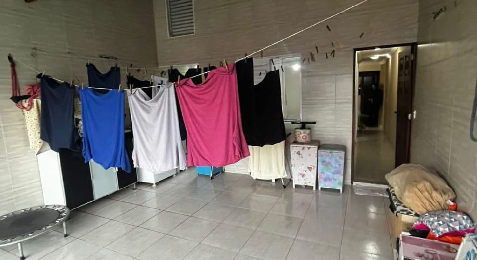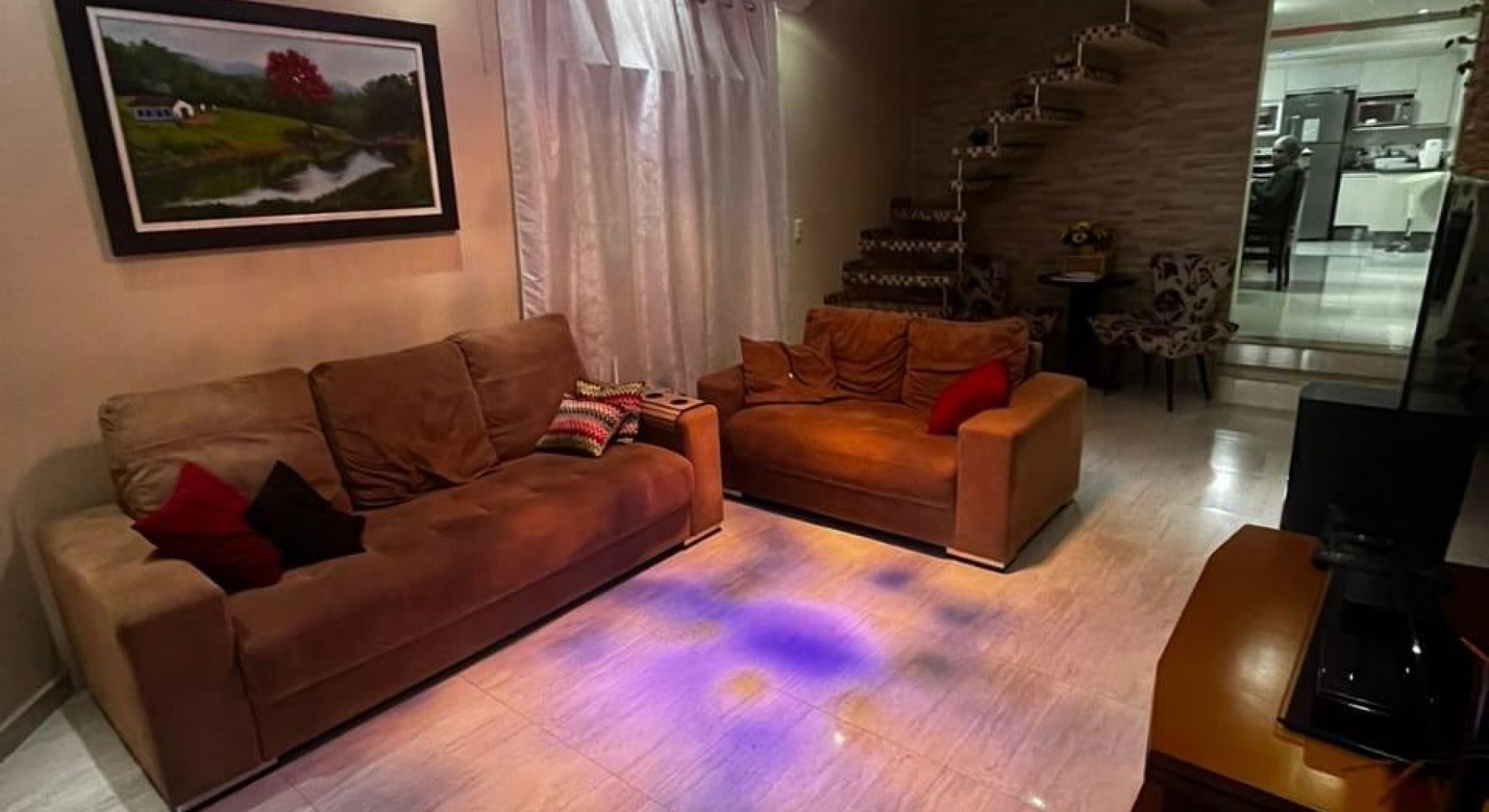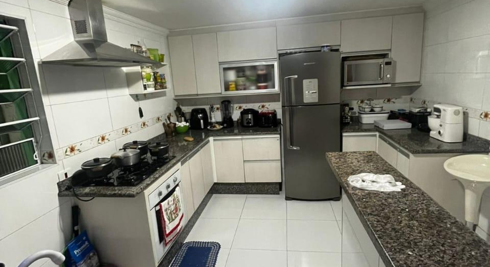Tem 3 quartos, sala de jantar e sala de estar, cozinha, área de serviço com churrasqueira, e garagem com vaga até 2 carros.
